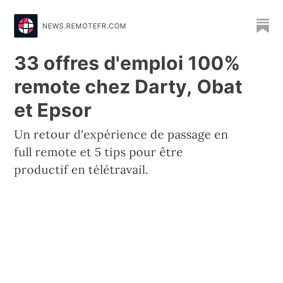 La newsletter RemoteFR est sortie đ ! Cette semaine, 33 offres en #fullremote mais aussi: - Le retour dâexpĂ©rience de Baptiste Hamain d sur le passage de sa boite en 100% remote - On apprend qu'on produit 50%âŻmoins de gaz Ă effet de serre quand on est en 100%âŻ#tĂ©lĂ©travail - Des tips sur comment ĂȘtre productif en full-remote - Et la question la plus important Ă poser en entretien d'embauche. Je met le lien dans le premier commentaire !